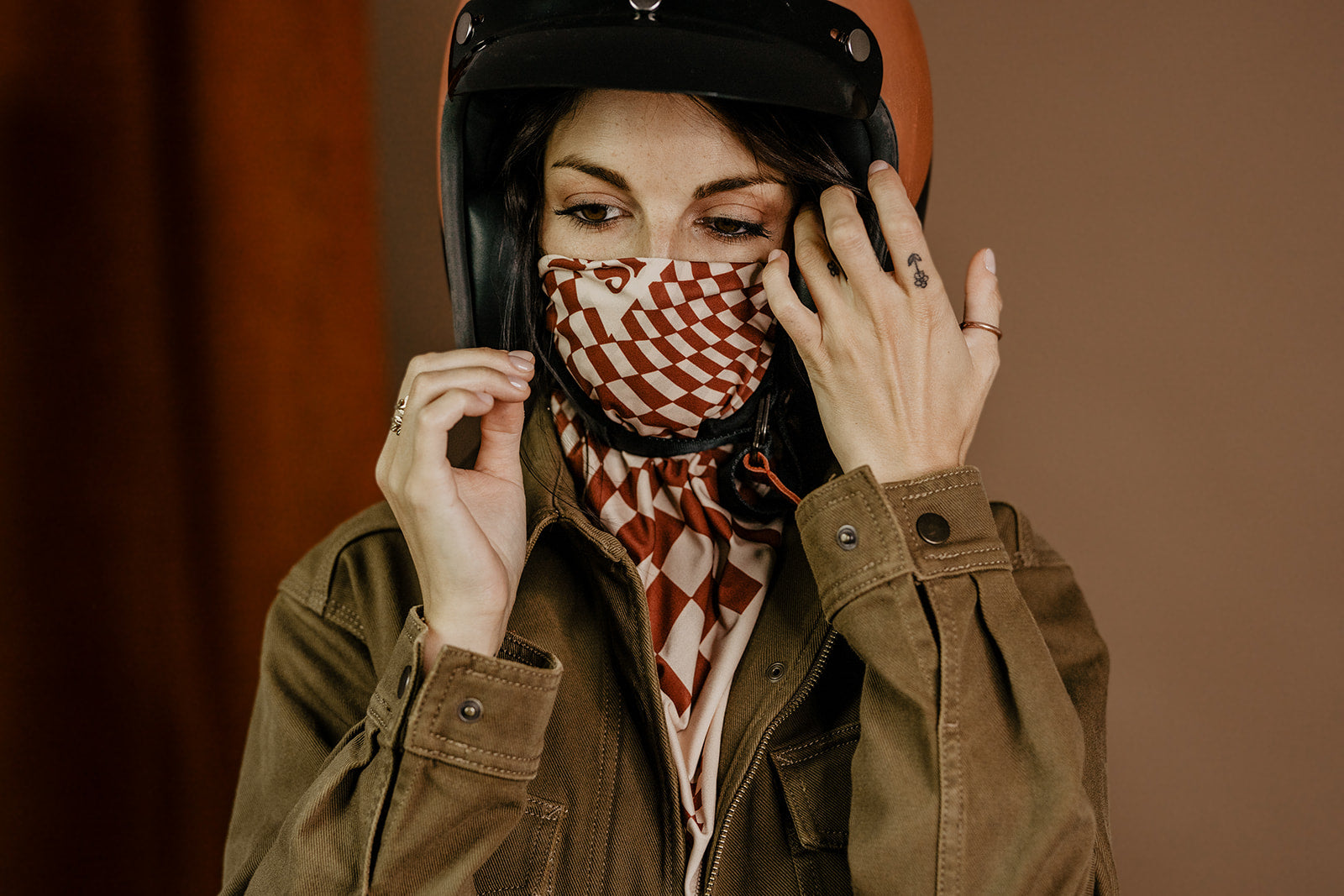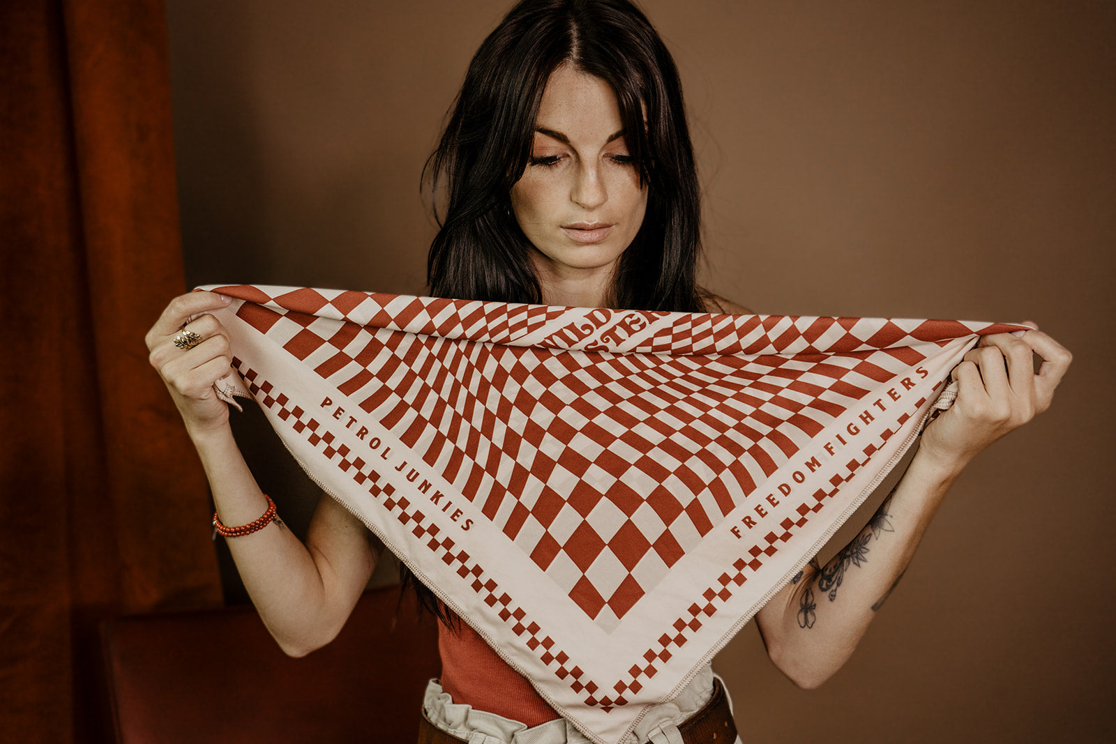 Ein elegantes Retro-Design, das den Geist des „Vintage Racing“ mit der Atmosphäre der sechziger Jahre verbindet. Das Schachbrett, das direkt mit Auto- und Motorradrennen assoziiert wird, ist im psychedelischen Stil der 60er Jahre verdreht. Und wie du bereits weisst, hat Wildust Sisters eine besondere Vorliebe für die Farbe Terracotta. Deshalb haben sie dieses hübsche Schachbrettmuster in der Flaggschiff-Farbe des wilden Staubs angelehnt!